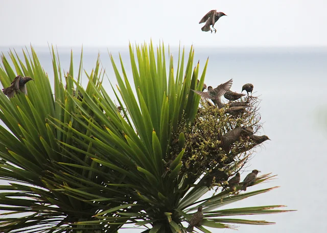 The birds have been checking out the seeds on the palm tree for a while, today they must have been just right, because the huge flock of Starlings zoomed in