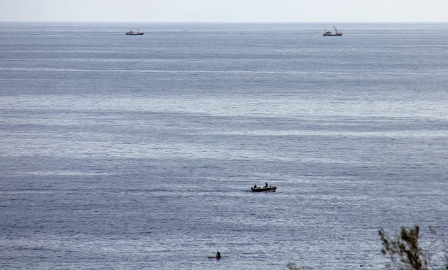 Fishing vessels Trevessa IV and Algrie heading back to Newlyn with Nick & son from Trenow on their way in from a fishing trip and at the bottom a board paddler taking a rest !