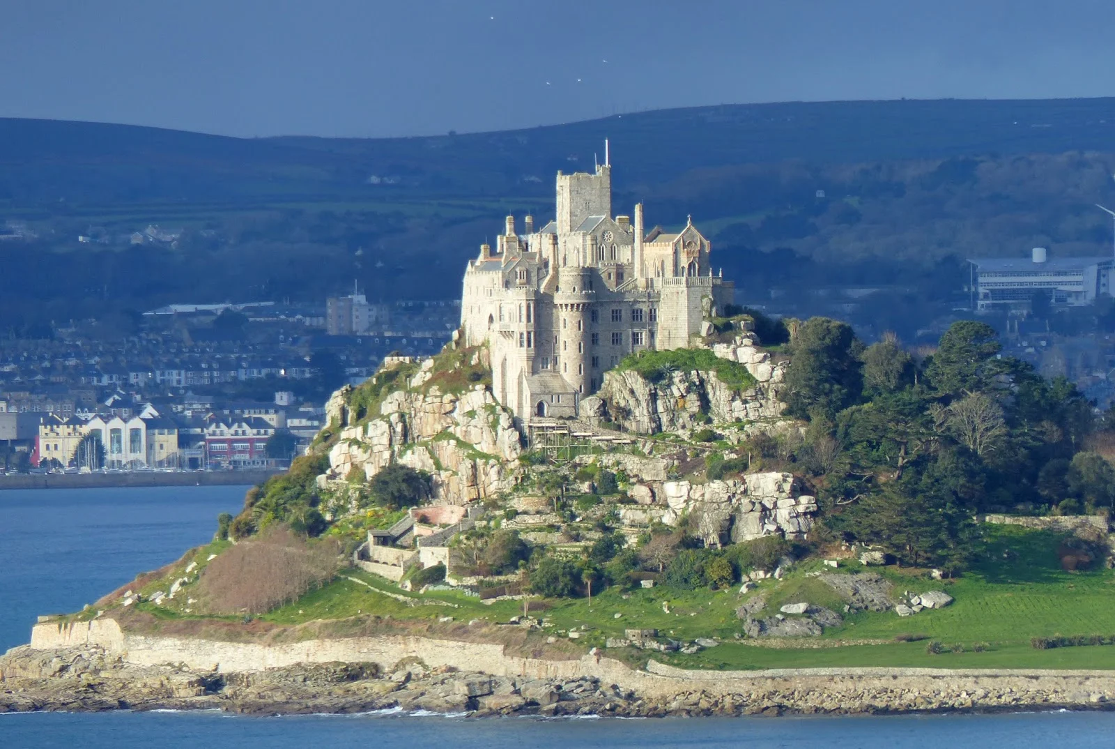 The Mount in the shade, but the hills behind Penzance in the sunshine