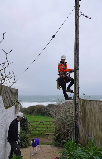 What a night that was, huge gusts of wind and heavy rain. Maisie was rather scared of all the noise so we waited - watching tv - until the power went of at 2.10am fortunately we have plenty of battery lights and we managed to get the dogs into the garden - really scary out there with the noise of the wind in the trees and the crashing sea. They eventually settled - when we got up I'd had a text from neighbour Theresa to say that National Grid should be with us in around two and a half hours.